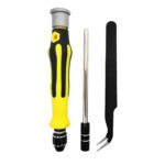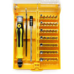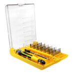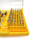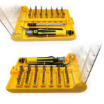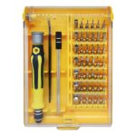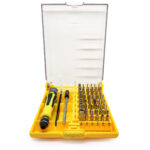 ست پیچ گوشتی 45 قطعه حرفه ای شامل ابزارهای مصرفی برای تعمیرات موبایل و لوازم الکترونیکی است که شامل 1 عدد دسته، 1 عدد پنس، 1 عدد آچار با قابلیت تعویض 42 عدد سری های مختلف (2 سو و 4 سو و ستاره ای و بکس) است.