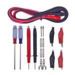 یک جفت پراب مولتی متر چندکاره 1000V با روکش سراسری عایق در قسمت نگه داری در دست و کابل به دو رنگ مشکی و قرمز، 4 عدد فیش سوسماری متوسط و 8 عدد سری فلزی تست جهت اتصال به مالتی متر یا مدار جهت اندازه گیری کمیت های مورد نظر از جمله ولتاژ، جریان، دما و… مورد استفاده قرار میگیرد.